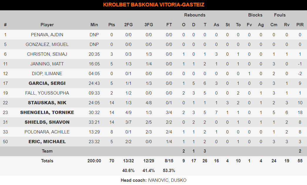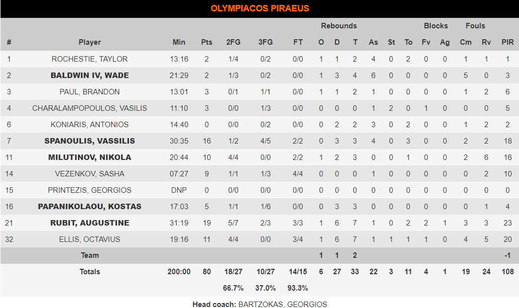 Οι Ερυθρόλευκοι επικράτησαν με 80-70 των Βάσκων, έχοντας ως απόλυτο πρωταγωνιστή τον Οκτάβιους Έλις με 11 πόντους, εφτά ριμπάουντ και περίσσια ενέργεια και στις δύο πλευρές του παρκέ.