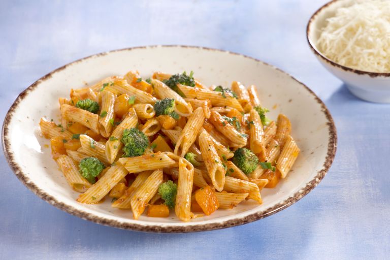 Προθερμαίνουμε τον φούρνο στους 200°C. Ρίχνουμε τα ζυμαρικά μέσα στην κατσαρόλα με την κολοκύθα, ανακατεύουμε καλά και αποσύρουμε από τη φωτιά. Στη συνέχεια τα μεταφέρουμε σε ένα πυρέξ ή ταψί. Κόβουμε την ντομάτα σε λεπτές φέτες, τις οποίες απλώνουμε πάνω στα ζυμαρικά σε μία στρώση. Αναμειγνύουμε την τριμμένη φρυγανιά με τη σκόνη σκόρδου και το μείγμα μπαχαρικών και καλύπτουμε την επιφάνεια του ταψιού. Ψήνουμε για 5–10 λεπτά και σερβίρουμε το φαγητό όσο είναι ζεστό.