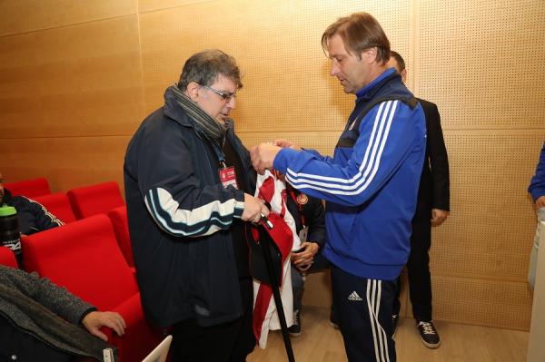 Πριν ξεκινήσει τη συνέντευξη Τύπου ο Πέδρο Μαρτίνς δώρισε μία φανέλα του Ολυμπιακού στον δημοσιογράφο Κώστα Ταγκαλάκη, ο οποίος αντιμετώπισε ένα σοβαρό πρόβλημα υγείας.