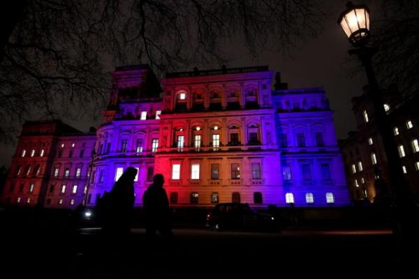 Παράλληλα, διαφορετικό αέρα στη βρετανική πρωτεύουσα έδωσε και η φωταγώγηση κτιρίων που στεγάζονται υπουργεία σε κόκκινο και μπλε, τα χρώματα της βρετανικής σημαίας.