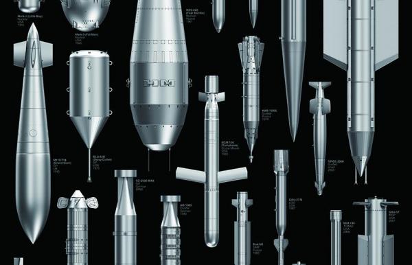 Οι βόμβες παρατίθενται σε χρονολογική σειρά, από μια χειροβομβίδα του 1911 μέχρι έναν κατευθυνόμενο πύραυλο με πυρηνική κεφαλή του 2019