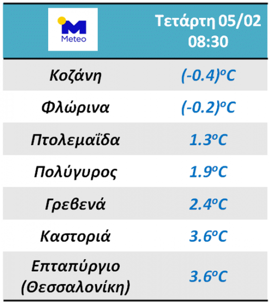 Χαμηλές θερμοκρασίες και χιονοπτώσεις στα ορεινά και ημιορεινά καταγράφονται στη Θράκη και στη Μακεδονία το πρωί της Τετάρτης, όπως φαίνεται στον πίνακα που παρουσιάζει τις θερμοκρασίες που κατέγραψαν επιλεγμένοι σταθμοί του δικτύου του Εθνικού Αστεροσκοπείου Αθηνών / meteo.gr στις 08:30 το πρωί.