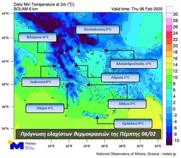 Η θερμοκρασία θα συνεχίσει την πτώση της σε όλη τη χώρα, φτάνοντας στην ελάχιστη τιμή της την Πέμπτη ή τις πρώτες ώρες της Παρασκευής . Στο χάρτη που ακολουθεί φαίνεται η κατανομή της ελάχιστης θερμοκρασίας που αναμένεται την Πέμπτη καθώς και την τιμή της σε 8 μεγάλες πόλεις της χώρας. Σημειώνεται ότι στις περισσότερες περιοχές η ελάχιστη θερμοκρασία θα σημειωθεί προς το τέλος του εικοσιτετραώρου.