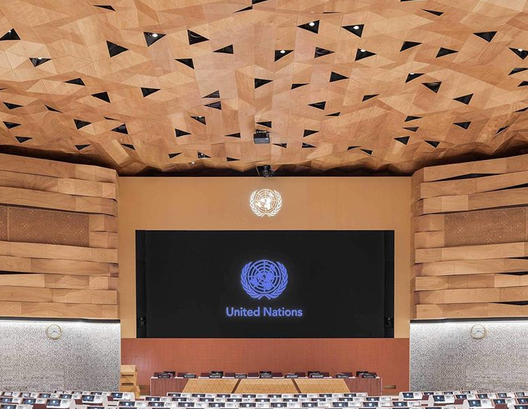 Η καινούρια επικάλυψη της αίθουσας συνεδριάσεων στην ευρωπαϊκή έδρα του Οργανισμού Ηνωμένων Εθνών στη Γενεύη «επανερμηνεύει τη διπλωματία, παράδοση, καλλιγραφία και τοπίο του Κατάρ, με σύγχρονα υλικά».