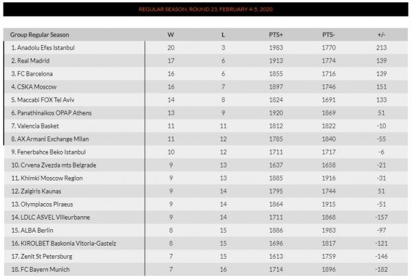 Τα αποτελέσματα και η βαθμολογία της Ευρωλίγκας