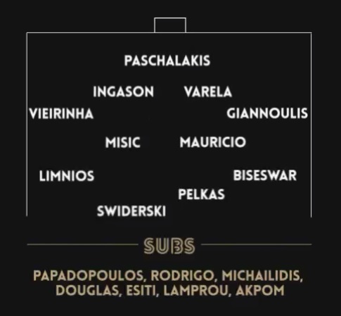 Πιο συγκεκριμένα, κάτω από τα δοκάρια θα είναι ο Πασχαλάκης και στην άμυνα από δεξιά προς αριστερά οι Βιεϊρίνια, Ίνγκασον, Βαρέλα, Γιαννούλης. Στα χαφ θα βρίσκονται οι Μίσιτς, Μαουρίτσιο, ενώ στα άκρα θα αγωνιστούν οι Λημνιός και Μπίσεσβαρ.