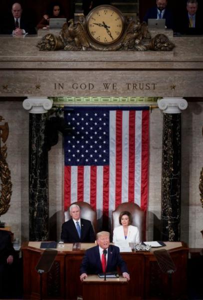 Το ετήσιο μεγάλο ραντεβού του προέδρου και των μελών της Βουλής των Αντιπροσώπων και της Γερουσίας είχε αρχίσει με άλλη μια σκηνή που πιστοποίησε τον διχασμό των Ρεπουμπλικάνων και των Δημοκρατικών: ο πρόεδρος Τραμπ αγνόησε το χέρι που του έτεινε η Νάνσι Πελόζι.