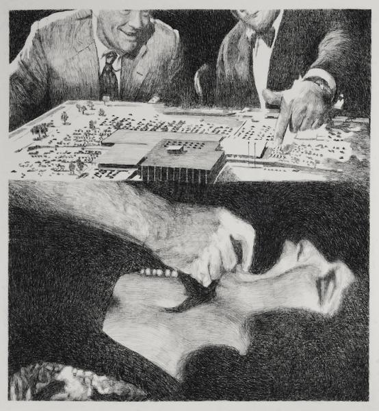 Οι φωτογραφίες αρχείου που αποτέλεσαν την πρώτη ύλη για τα έργα αντικατοπτρίζουν μια πλευρά της πραγματικότητας που δεν μπορώ να προσπεράσω και με κάποιο τρόπο πρέπει να διαχειριστώ. Ζόμπι, πορνό, φρούτα από διαφημίσεις, αδαμαντορυχείο, χρυσωρυχείο, έρημος, βουτιά σε κάδο σκουπιδιών, μια σπουδαία μποντιμπίλντερ, ο σοσιαλιστής πατέρας του εμπορικού κέντρου, fembot («θηλυκό» ρομπότ), λουλούδια που ουρλιάζουν, λουλούδι-πτώμα, διαδικτυακή φροντίδα ASMR, οθόνες τηλεόρασης, ο Οπενχάιμερ και η βομβίτσα του κ.ά.: κοντά στην λογική του κολάζ, πετσόκοψα τις αρχικές φωτογραφίες για να τις συναρμολογήσω σαν απλά Φρανκενστάιν που χρειάστηκαν το καθένα μόνο δύο πτώματα. Είναι ένας πρακτικός τρόπος σκέψης γύρω από τις πηγές και τα συναισθήματα που φέρουν. Έτσι έχω την αίσθηση ή την ψευδαίσθηση ότι τα κάνω δικά μου και μέσα απ’ αυτήν τη διαδικασία τα αλλοιώνω, τα αποκαλύπτω κάτω από ένα άλλο φως, ίσως τους ανοίγω τρύπες που μπάζουν προς άλλες κατευθύνσεις, ίσως φτιάχνω κάτι όμορφο από κάτι άσχημο, ή δείχνω μέσα στο άσχημο κάτι όμορφο εστιάζοντας με διαφορετικό τρόπο.