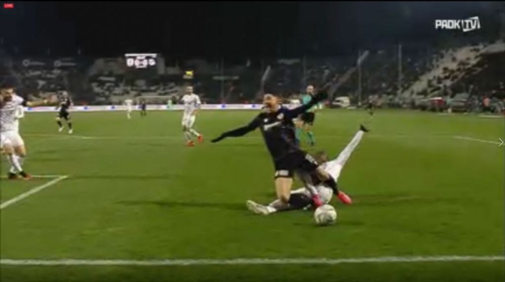 Ο Έλληνας άσος πέφτει με… στυλ στο έδαφος και ο Φωτιάδης τρέχει να σφυρίξει πέναλτι.