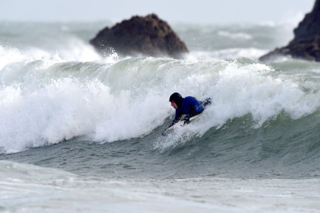 Ένας ατρόμητος σέρφερ στο Χάστινγκς, κοντά στο Σάσεξ, αποφάσισε να δαμάσει τα κύματα την ώρα που η καταιγίδα Κιάρα μαινόταν.