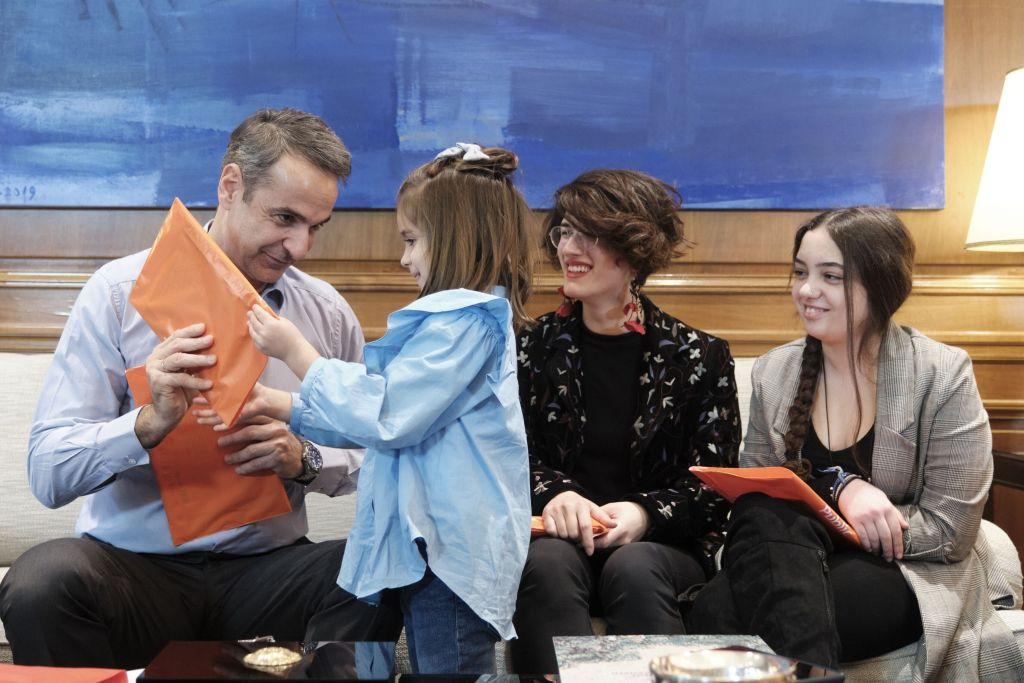 Ο Κυριάκος Μητσοτάκης καλωσόρισε τα παιδιά και τους γονείς τους στο Μέγαρο Μαξίμου λίγο μετά τις 12.00 το μεσημέρι και είχαν την ευκαιρία να συζητήσουν για αρκετή ώρα.