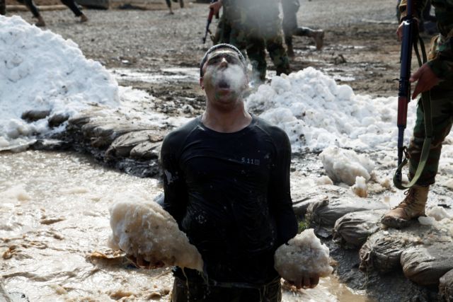 Οι «απόφοιτοι» στρατιώτες Πεσμεργκά - στις τάξεις των οποίων περιλαμβάνονται και γυναίκες - επιδόθηκαν, επίσης, σε διάφορα στρατιωτικά γυμνάσια: κυλίστηκαν στις λάσπες, έπεσαν μέσα σε ένα λάκκο με παγωμένο νερό και χιόνι, ενώ έδειξαν την ευλυγισία τους και τις ικανότητές τους στις πολεμικές τέχνες.