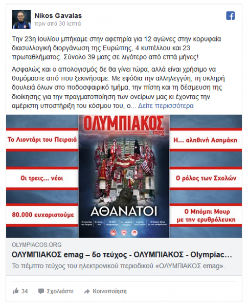 Παράλληλα, παρουσίασε μέσω του επίσημου λογαριασμού του στο Facebook και το 5ο τεύχος του Ολυμπιακός emag, το οποίο είναι αφιερωμένο στα θύματα της τραγωδίας της Θύρας 7.