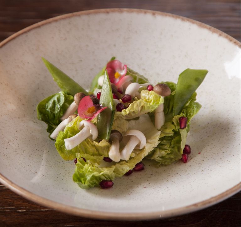 Πλένουμε τα μαρούλια και τα στρώνουμε. Προσθέτουμε τα μανιτάρια και τα σπόρια από το ρόδι. Περιχύνουμε με μπαλσάμικο και αλατοπίπερο.