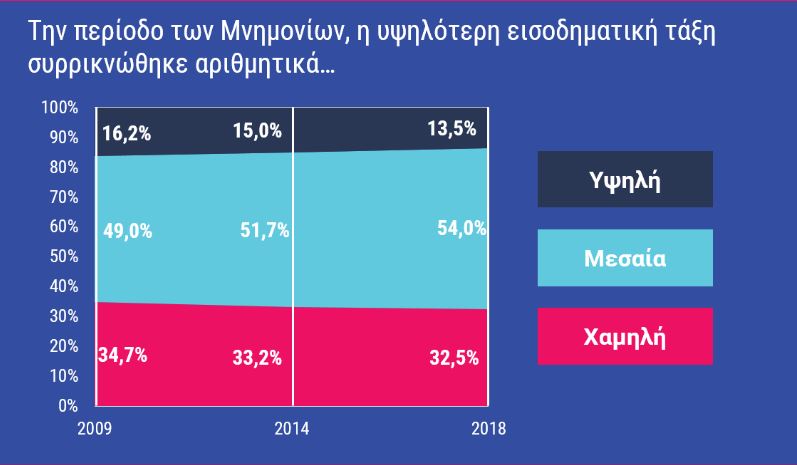 Αναλύοντας τα μικροδεδομένα των Ερευνών Εισοδήματος και Συνθηκών Διαβίωσης της ΕΛΣΤΑΤ από το 2003 και μετά, την περίοδο των Μνημονίων παρατηρείται μια διόγκωση του μεριδίου των νοικοκυριών (και των αντίστοιχων εισοδημάτων) της μεσαίας εισοδηματικής τάξης, αλλά και της χαμηλής εισοδηματικής τάξης άνω του ορίου της φτώχειας, με αντίστοιχη μείωση του μεριδίου των νοικοκυριών της υψηλής εισοδηματικής τάξης και της χαμηλής εισοδηματικής τάξης κάτω του ορίου της φτώχειας.