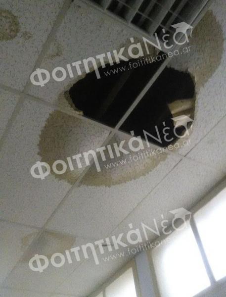 Διαρροή νερού στο κλειστό σύστημα θέρμανσης είχε ως αποτέλεσμα να «ποτίσει» η ψευδοροφή σε διάδρομο έξω από αίθουσα διδασκαλίας και ένα κομμάτι της να σπάσει και να αποκολληθεί αφήνοντας μία τρύπα