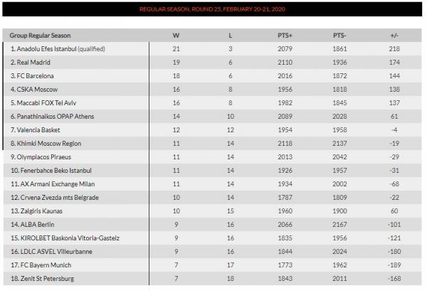 Τα αποτελέσματα και η βαθμολογία της Ευρωλίγκας