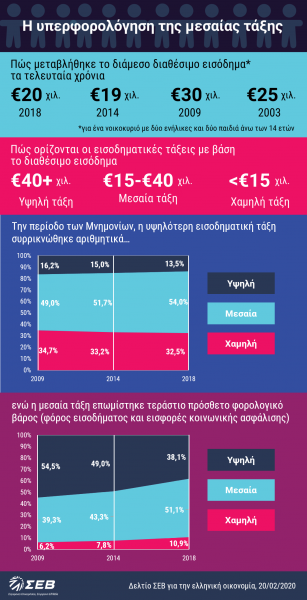 Σύμφωνα με τον ΣΕΒ την περίοδο από το 2010 έως το 2018 η μεσαία εισοδηματική τάξη καταβάλλει σήμερα το 51% των φορολογικών εσόδων, ενώ πριν την κρίση κατέβαλε το 39,3%. Αντίστοιχα, η υψηλότερη εισοδηματική τάξη, που συρρικνώθηκε αριθμητικά και εισοδηματικά, σήμερα καταβάλει το 38,1% των φορολογικών εσόδων έναντι άνω του 50% που κατέβαλε πριν την κρίση.