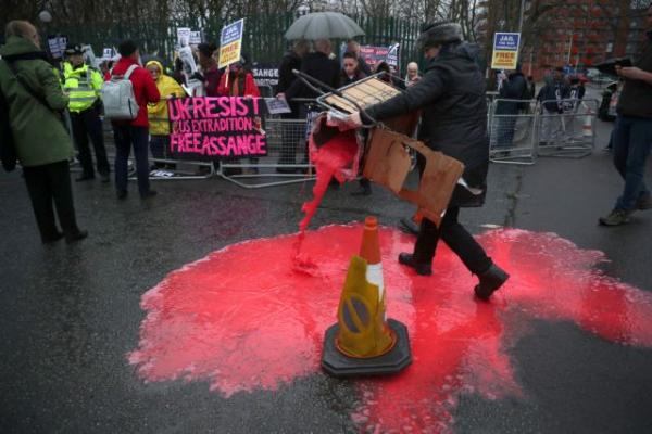 Δεκάδες άνθρωποι συμπαραστάθηκαν στον κατηγορούμενο ιδρυτή του ιστότοπου WikiLeaks φωνάζοντας συνθήματα όπως «απελευθερώστε τον Τζούλιαν Ασάνζ», «φυλακίστε τους εγκληματίες πολέμου», «μην πυροβολείτε τον αγγελιοφόρο» και «μην εκδώσετε τον Ασάνζ: η δημοσιογραφία δεν είναι έγκλημα».