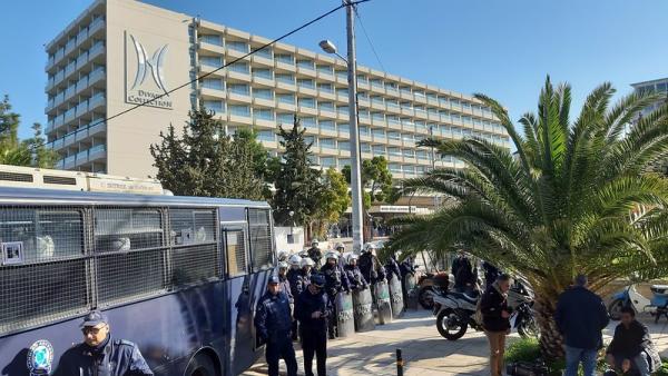 Από το πρωί η αστυνομία είχε κλείσει τους περισσότερους κάθετους στη Λεωφόρο Βουλιαγμένης δρόμους. Η οδός Ηλίου όπου βρίσκεται το ξενοδοχείο στο οποίο διεξάγεται το συνέδριο ήταν κλειστή, ενώ ισχυρές δυνάμεις των ΜΑΤ απαγόρευαν την πρόσβαση σε αυτό.
