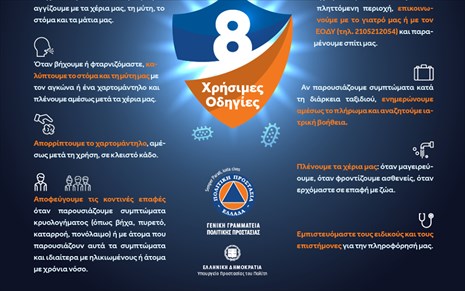 Η καμπάνια ενημέρωσης που ξεκίνησε ήδη από την ΓΓΠΠ, περιλαμβάνει οκτώ βασικές συμβουλές που αφορούν στα μέτρα προφύλαξης και τις ενέργειες του κάθε πολίτη προσωπικά, πρώτον για την προστασία τους από τον κοροναϊό και δεύτερον για τον περιορισμό της μετάδοσης του.