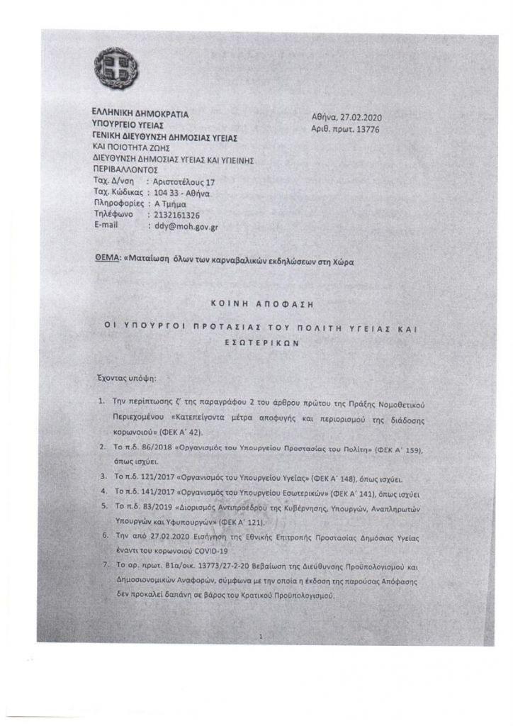 Στη δημοσιότητα έδωσε η κυβέρνηση την απόφαση με την οποία ακυρώνονται όλες οι καρναβαλικές εκδηλώσεις εξαιτίας των συμπτωμάτων του κοροναϊού.