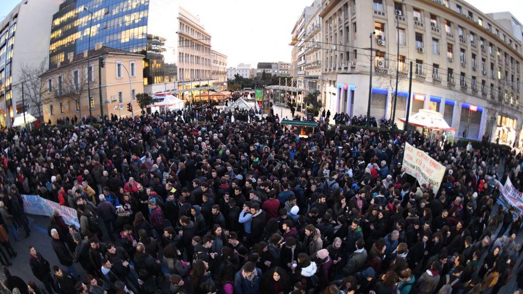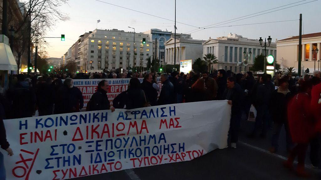 Με κεντρικό σύνθημα «Να αποσυρθεί ο νόμος λαιμητόμος Κατρούγκαλου- Βρούτση», εργατικά συνδικάτα, ομοσπονδίες, εργατικά κέντρα, φοιτητικοί σύλλογοι συγκεντρώθηκαν στις 18:30 στα Προπύλαια επί της οδού Πανεπιστημίου για να διαδηλώσουν ενάντια στο ασφαλιστικό νομοσχέδιο.