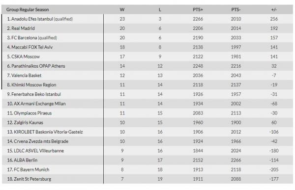 Τα αποτελέσματα και η βαθμολογία της Ευρωλίγκας