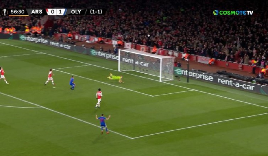 Ο Κώστας Τσιμίκας λίγα λεπτά μετά το γκολ του Ολυμπιακού, έχασε μια σπουδαία ευκαιρία για να δώσει ξεκάθαρο προβάδισμα πρόκρισης στους Ερυθρόλευκους στο Λονδίνο.