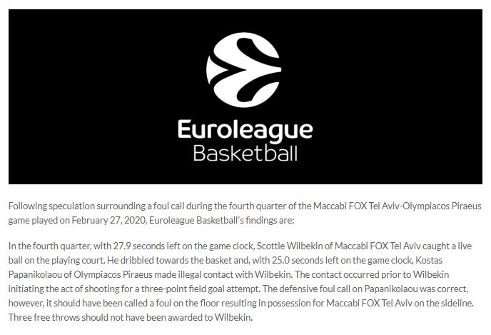 Μεταξύ άλλων η ανακοίνωση αναφέρει: «Στο τέταρτο δεκάλεπτο και με 27,9 δευτερόλεπτα να απομένουν, ο Σκότι Ουίλμπεκιν της Μακάμπι Τελ Αβίβ είχε την κατοχή. Εκανε ντρίπλα προς το αντίπαλο καλάθι, και στα 25 δευτερόλεπτα που απέμεναν στο ρολόι, ο Κώστας Παπανικολάου του Ολυμπιακού, προχώρησε σε παράνομη επαφή. Το φάουλ του Παπανικολάου ήταν σωστό, όμως θα έπρεπε να δοθεί φάουλ χαμηλά, δίνοντας έτσι την κατοχή στην Μακάμπι Τελ Αβίβ από την πλάγια γραμμή. Δεν θα έπρεπε να δοθούν τρεις βολές στον Σκότι Ουίλμπεκιν».