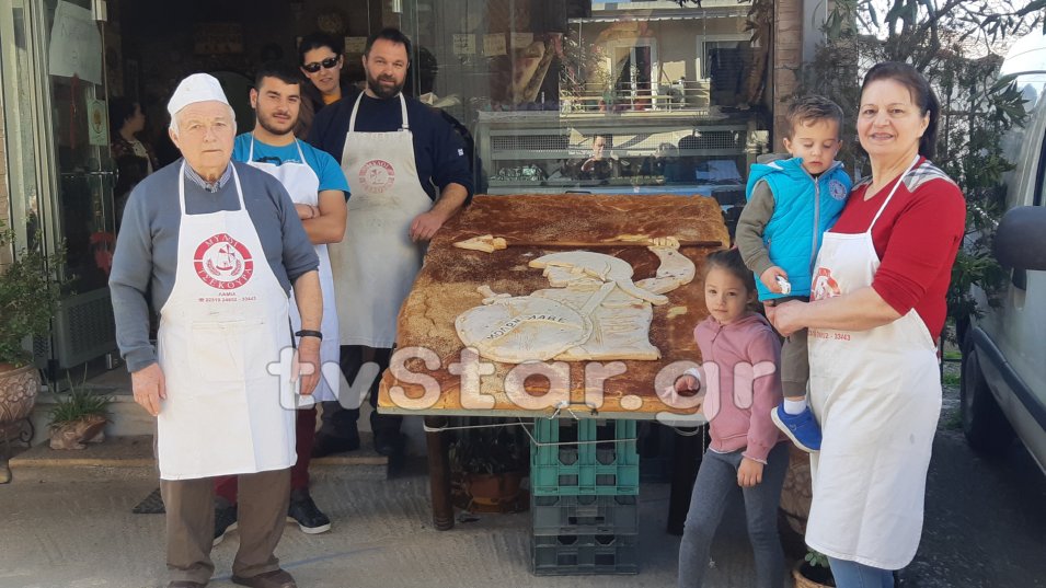 Η γιγαντιαία λαγάνα του φούρνου Αντωνίου στη Φθιώτιδα έχει βάρος 160 κιλά. Χρειάστηκαν 120 κιλά αλεύρι και 8 ώρες για να ετοιμαστεί.
