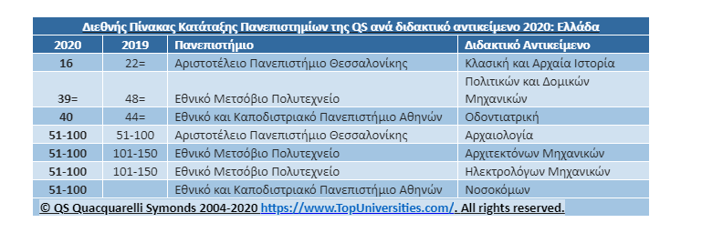 Ο κ. Jack Moran, εκπρόσωπος της QS, δήλωσε σχετικά ότι : «Μετά από χρόνια οικονομικής πάλης, η φετινή έκδοση των Διεθνών Πινάκων Κατάταξης Πανεπιστημίων της QS ανά Διδακτικό Αντικείμενο, υποδηλώνει ότι η Ελληνική τριτοβάθμια εκπαίδευση μπορεί να ανακάμψει. Με βάση τον δείκτη με τις Βιβλιογραφικές Αναφορές (Citations per Paper) – που χρησιμοποιεί η QS 27 από τα 75 προγράμματα ερευνών της Ελλάδας λαμβάνουν βαθμολογία 80/100 ή παραπάνω. Αυτό αποδεικνύει την πνευματική αριστεία που υπάρχει στα πανεπιστήμια της Ελλάδας «.