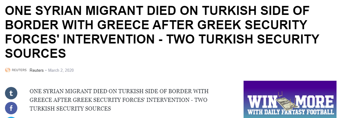 Αξίζει να σημειωθεί ότι δεν είναι η πρώτη φορά που η Τουρκία κάνει λόγο για θάνατο πρόσφυγα από ελληνικά πυρά. Τη Δευτέρα, 2 Μαρτίου, και πάλι τουρκικά ΜΜΕ έκαναν λόγο για πρόσφυγα που «πυροβολήθηκε στην πλάτη από έλληνα στρατιώτη και έπεσε νεκρός».