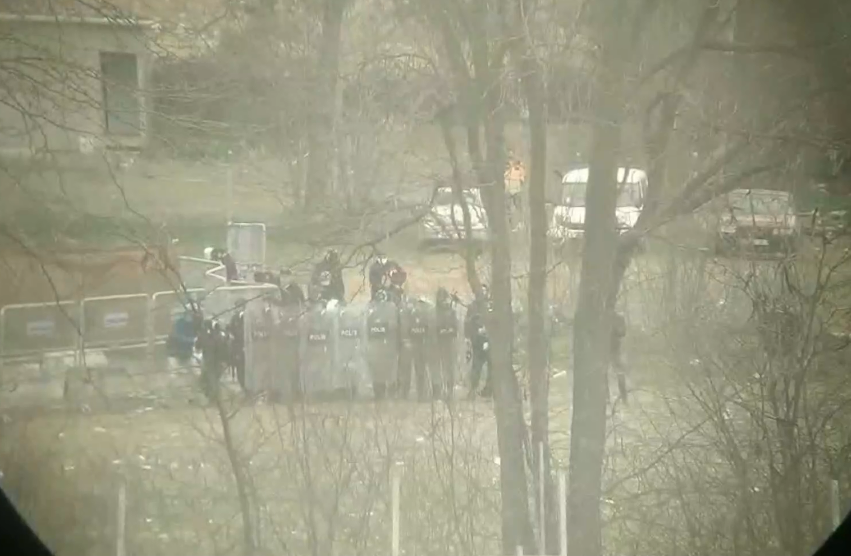 Διμοιρία της τουρκικής αστυνομίας φαίνεται να ρίχνει με πολλαπλούς εκτοξευτές καπνογόνα και δακρυγόνα προς τις ελληνικές δυνάμεις, οι οποίες βρίσκονται σε απόσταση λίγων μέτρων από τα σύνορα