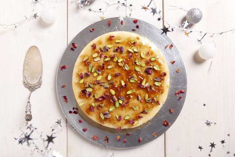 Γαρνίρισμα: Απλώνουμε 2-3 κ.σ. γλυκό τριαντάφυλλο, σε πολύ λεπτή στρώση σε όλη την επιφάνεια του γλυκού. Πασπαλίζουμε με τα φιστίκια και διακοσμούμε με τα αποξηραμένα πέταλα.