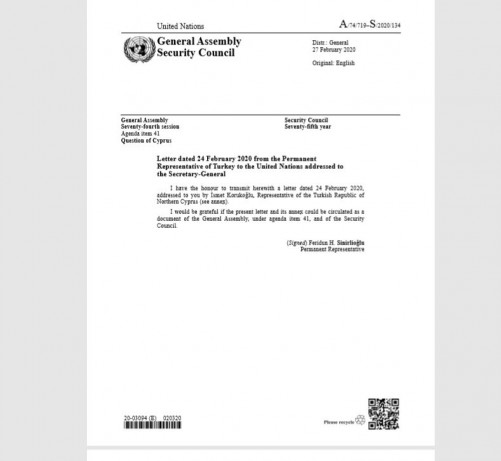 «Σύμφωνα με τις οδηγίες της κυβέρνησής μου (ψευδοκράτος), γράφω σε απάντηση της επιστολής της 4ης Φεβρουαρίου 2020 που απευθύνθηκε σε εσάς από τον Ελληνοκύπριο εκπρόσωπο στη Νέα Υόρκη και κυκλοφόρησε ως έγγραφο της Γενικής Συνέλευσης και του Συμβουλίου Ασφαλείας (A / 74/628-S / 2020/92), η οποία, για άλλη μια φορά, διαστρεβλώνει την πραγματικότητα στην πράξη.