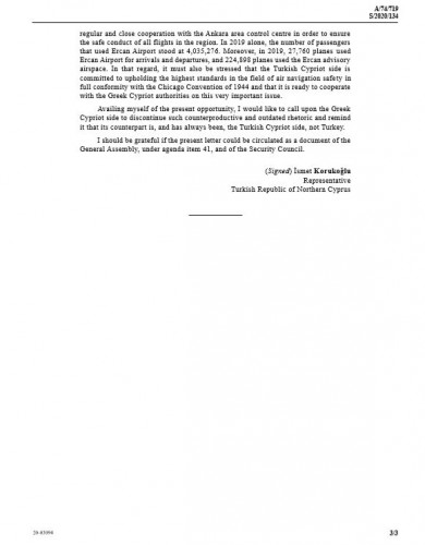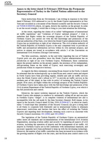 Οι ψευδείς ισχυρισμοί, όπως και στην προαναφερθείσα επιστολή σχετικά με τη χρήση τουρκοκυπριακών λιμένων, είναι επίσης αβάσιμοι, αφού η κυβέρνηση της Ελληνοκυπριακής Διοίκησης δεν έχει δικαιοδοσία ή δικαίωμα να έχει αξιώσεις από τη Βόρεια Κύπρο. Επιπλέον, οι ισχυρισμοί αυτοί αγνοούν τις σημερινές πραγματικότητες, δηλαδή την ύπαρξη δύο ανεξάρτητων, αυτοδιοικούμενων κρατών στη νήσο της Κύπρου, όπου κάθε ένα ασκεί κυριαρχία και δικαιοδοσία εντός της αντίστοιχης επικράτειάς του. Όσον αφορά τις ψευδείς δηλώσεις σχετικά με το αεροδρόμιο Ercan στο Βορρά, θα πρέπει να επαναληφθεί ότι το τεχνολογικά αναβαθμισμένο κέντρο ελέγχου της περιοχής Ercan και το αεροδρόμιο της Βόρειας Κύπρου παρέχουν τακτικά, αξιόπιστα και ασφαλή δρομολόγια από το 1977 όταν υπήρξε άρνηση της ελληνοκυπριακής πλευράς την παροχή υπηρεσιών εναέριας κυκλοφορίας στο βόρειο τμήμα του νησιού, σύμφωνα με την πολιτική της απομόνωσης του τουρκοκυπριακού λαού. Από τότε όλες οι πτήσεις εντός του κυρίαρχου εναέριου χώρου της Τουρκικής Δημοκρατίας της Βόρειας Κύπρου πραγματοποιήθηκαν με πλήρη γνώση και άδεια του Τμήματος Πολιτικής Αεροπορίας της Τουρκικής Δημοκρατίας της Βόρειας Κύπρου, επί της οποίας έχει πλήρη δικαιοδοσία και έλεγχο.