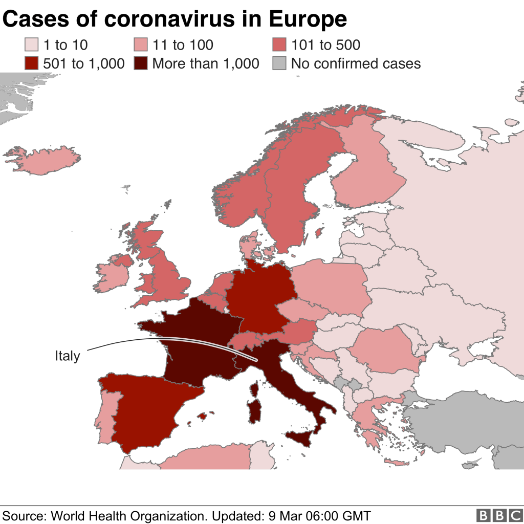 Μετά την Ιταλία, η οποία έχει τα πρωτεία σε κρούσματα και νεκρούς, οι χώρες με τα περισσότερα κρούσματα είναι η Γαλλία και η Γερμανία. Ανησυχία προκαλεί το γεγονός ότι η εξάπλωση του κοροναϊού βρίσκεται σε έξαρση και σε άλλες χώρες της Ευρώπης.