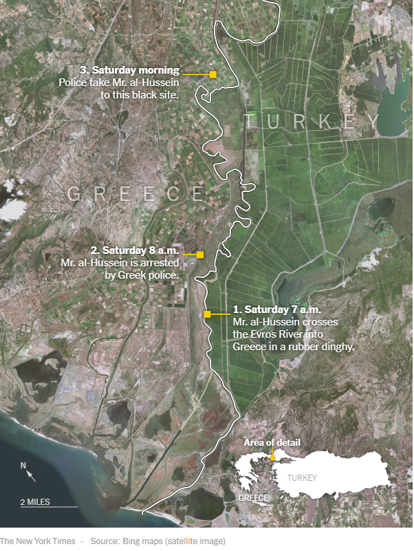 Μετά από μια νύχτα κατά την οποία δεν έφαγε και δεν ήπιε τίποτα, την 1η Μαρτίου, ο αλ-Χουσεΐν και δεκάδες άλλοι πρόσφυγες οδηγήθηκαν πίσω στον ποταμό Έβρο, όπου, σύμφωνα με το δημοσίευμα, οι έλληνες αστυνομικοί τους μετέφεραν πίσω στην τουρκική πλευρά σε ένα μικρό ταχύπλοο.