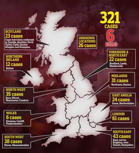 Ένας άντρας στα 80 του έτη, ο οποίος είχε ήδη θέματα υγείας, πέθανε λόγω του κοροναϊού. Ο αριθμός των νεκρών στο Ηνωμένο Βασίλειο ανέρχεται στους 6. Μετά την επίσημη ανακοίνωση, δόθηκε στη δημοσιότητα ότι ακόμη 50 άτομα διεγνώσθηκαν θετικά στον θανατηφόρο ιό.