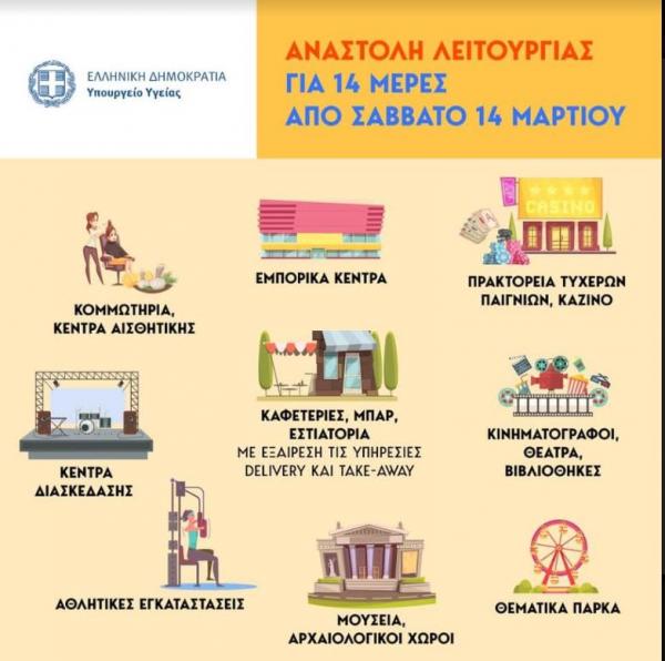 Νωρίτερα από το υπουργείο Υγείας είχε ανακοινωθεί ότι μετά από ομόφωνη εισήγηση της Επιτροπής Εμπειρογνωμόνων του Υπουργείου Υγείας για τον νέο κοροναϊό, αποφασίστηκε η αναστολή της λειτουργίας για 14 μέρες ξεκινώντας από αύριο Σάββατο 14 Μαρτίου, των παρακάτω: