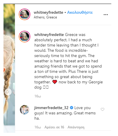 «Η Ελλάδα ήταν απλά τέλεια. Μου ήταν πολύ πιο δύσκολο το να φύγω απ’ ό,τι περίμενα πως θα είναι. Το φαγητό είναι εκπληκτικό. Ο καιρός δεν υπάρχει πουθενά αλλού και κάναμε σπουδαίους φίλους, με τους οποίους περάσαμε πάρα πολύ χρόνο».