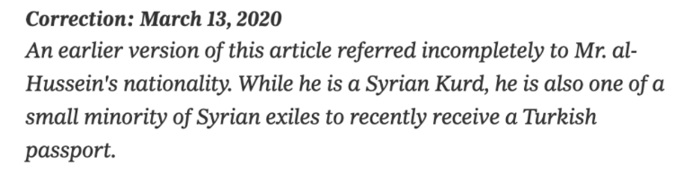 «Μια προηγούμενη εκδοχή αυτού του άρθρου αναφερόταν ελλιπώς στην υπηκοότητα του κ. αλ- Χουσεΐν. Ενώ είναι Συρο-κούρδος, είναι στη μικρή μειοψηφία Σύρων εξόριστων που πρόσφατα έλαβαν τουρκικό διαβατήριο» επισημαίνεται στο τέλος του ρεπορτάζ.