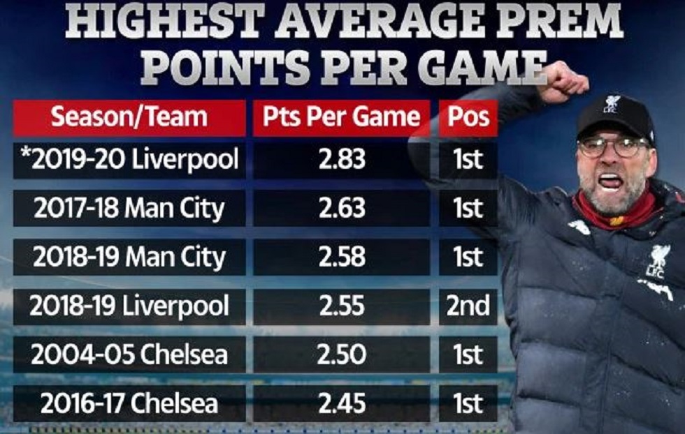 Και φυσικά το συγκεκριμένο ρεκόρ, κατατάσσει την ομάδα του Γιούργκεν Κλοπ στην κορυφή του μέσου όρου πόντων στην ιστορία της Premier League! 2,83 βαθμούς ανά παιχνίδι κατακτά μέχρι στιγμής στο φετινό πρωτάθλημα η… κόκκινη αρμάδα. Τουλάχιστον έτσι ήταν μέχρι τη διακοπή λόγω του κοροναϊού. Ερωτηματικό ακόμα αν θα συνεχιστεί η σεζόν.