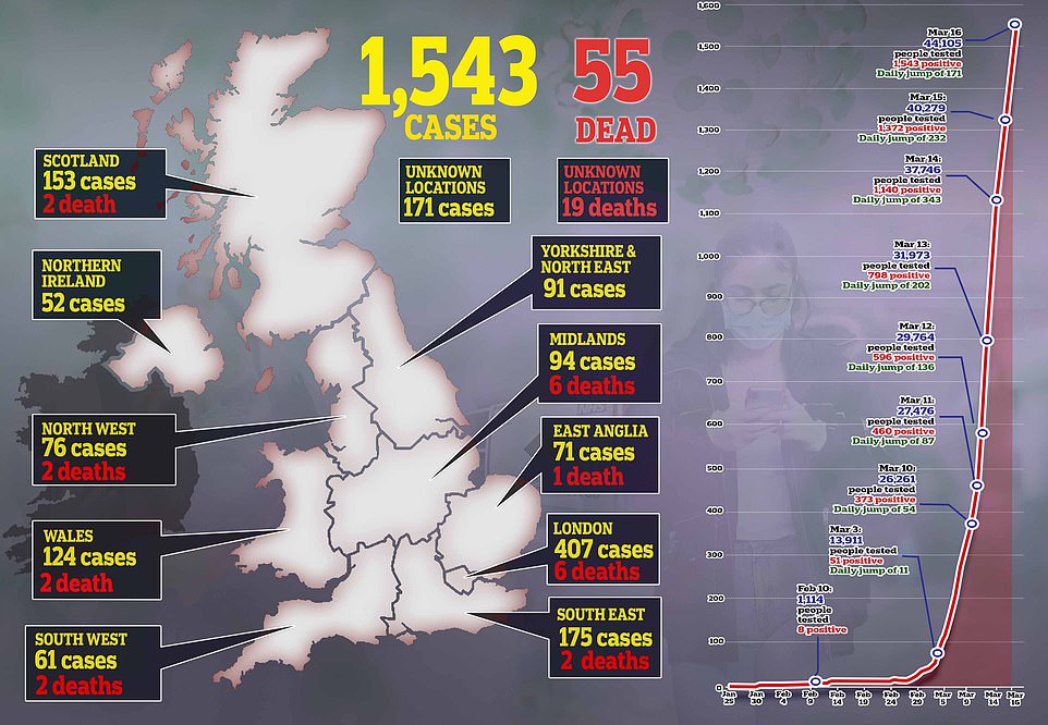 Ο αριθμός των θανάτων από κοροναϊό στο Ηνωμένο Βασιλείο έφτασε σήμερα τους 55 με μια νέα μεγάλη άνοδο, καθώς οι αξιωματούχοι της υγείας επιβεβαίωσαν ότι περισσότεροι από 1.500 ασθενείς στη Βρετανία έχουν πλέον διαγνωσθεί με τον κοροναϊό.