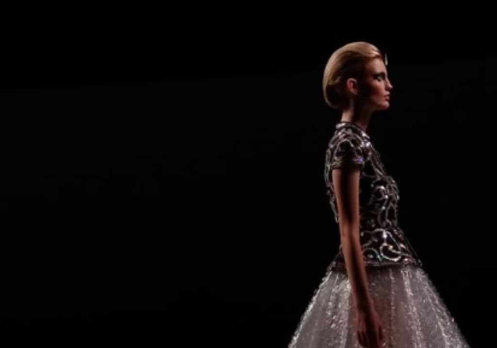 Έτσι πάνω στην πασαρέλα, τα μανεκέν με κεντημένα πανωφόρια, με φορέματα σε ροζ τούλι ή καναρινί και βαθιά ντεκολτέ, περπατούν φορώντας στο πρόσωπο εντυπωσιακές μάσκες με στρας γύρω από τα χείλη και τα μάτια.