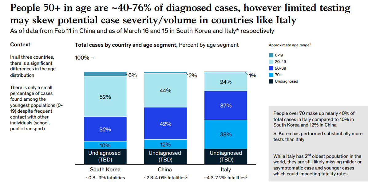 Είναι χαρακτηριστικό επίσης ότι οι άνθρωποι ηλικίας άνω των 50 ετών, συνιστούν το 40-76% των περιπτώσεων που έχουν διαγνωσθεί θετικές στον κοροναϊό και που κινδυνεύουν περισσότερο από τα συμπτώματά του. Αυτό το γράφημα εξηγεί άλλωστε γιατί στην Ιταλία οι θάνατοι σε αναλογία με τα κρούσματα ήταν αρκετά περισσότεροι σε σχέση με την Κίνα και τη Νότια Κορέα. Καθώς ο γηραιός πληθυσμός άνω των 70 ετών ξεπερνάει το 40% των κρουσμάτων, ενώ στις προαναφερθείσες χώρες ήταν 12% και 10% αντίστοιχα.