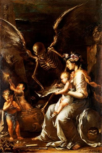 Ολες οι πόλεις της Πρώιμης Νεότερης Ευρώπης υπέφεραν από επιδημίες που επανέρχονταν συνεχώς και μπορούσαν να σκοτώσουν το 10-50% του πληθυσμού τους. Θεωρείται ότι τουλάχιστον οι μισοί κάτοικοι της Νάπολης – περισσότεροι από 200.000 άνθρωποι – πέθαναν από πανώλη το 1656. Το έργο του Ρόζα είναι μια αναφορά από την πρώτη γραμμή του θανάτου. Και μπορεί να το δει κανείς ως την απόλυτη μακάβρια δήλωση: ένα νεογέννητο μωρό υπογράφει μια συμφωνία με τον Θάνατο αναγνωρίζοντας ότι η ανθρώπινη ύπαρξη είναι άθλια και σύντομη. Ο Θάνατος είναι ένας τρομακτικός σκελετός με φτερά που υψώνονται μέσα στο επιτάφιο σκοτάδι του πίνακα. Ο Ρόζα επέζησε από την επιδημία της πανώλης του 1656, έχασε, όμως τον μικρό του γιο, τον αδελφό του και την αδερφή του, τον σύζυγό της και τα πέντε παιδιά τους. Το νήπιο του πίνακα είναι ο γιος του Ροζάλντο, που δέχεται την κυριαρχία του θανάτου.