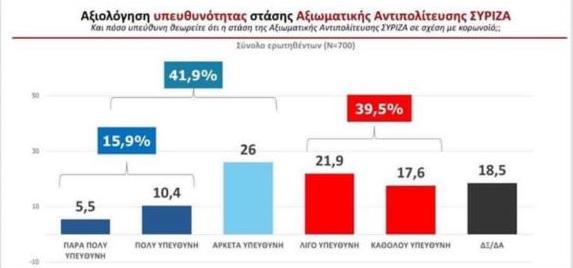 Διχασμένη είναι η κοινή γνώμη για την στάση του ΣΥΡΙΖΑ: Το 41,9 % την θεωρεί πολύ και αρκετά υπεύθυνη ενώ το 39,5% λίγο ή καθόλου υπεύθυνη.