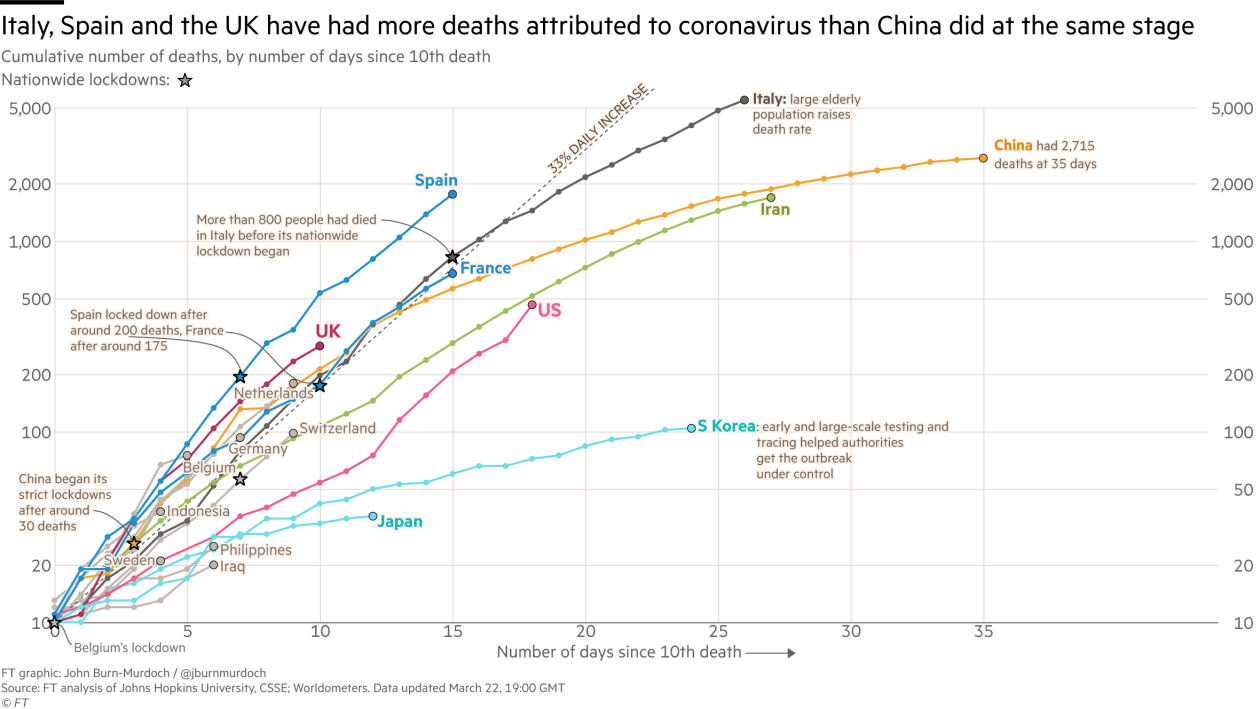 Όπως φαίνεται 10 μέρες μετά την ανακοίνωση του δέκατου θανάτου, η Ιταλία, η Ισπανία και η Βρετανία είχαν περισσότερους νεκρούς σε σχέση με την Κίνα.